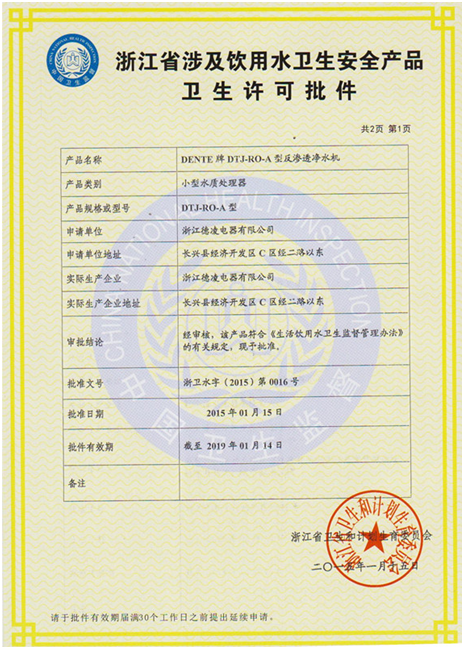 德恩特品牌全系凈水機已通過中國疾病預防控制中心環境與健康相關產品安全所檢驗合格。本月底將全獲得凈水機生產國家衛生批件。