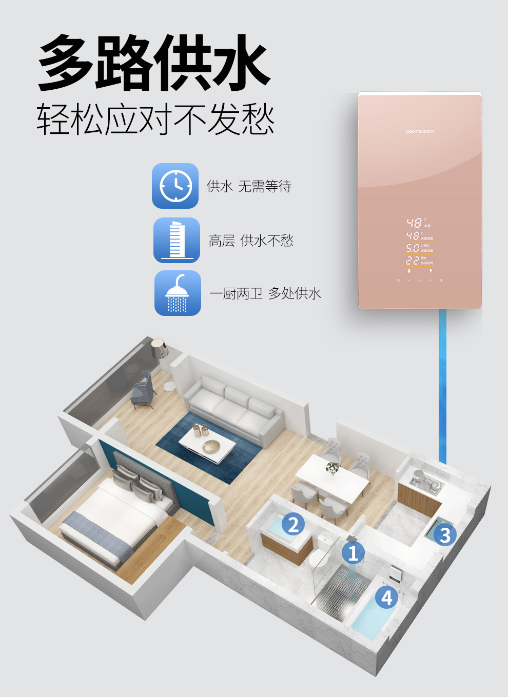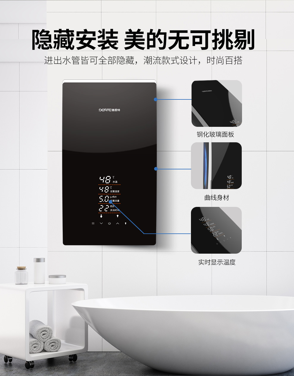 產品中心 > 即熱電熱水器系列> 德恩特DTR-P5A全隱藏安裝速熱大水量 玫瑰金/典雅黑V12系列